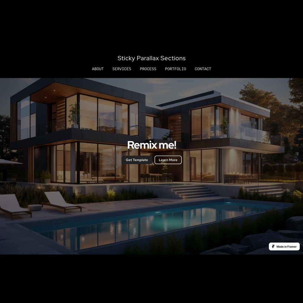 A Framer template composed of sticky page sections with parallax animations throughout. Included is a custom-coded navigation menu.